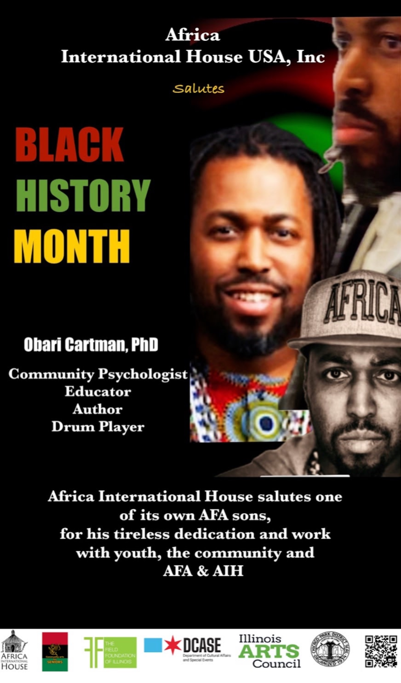 Africa International House USA, Inc. proudly salutes one of our own AFA sons, Dr. Obari Cartman — Community Psychologist, Educator, Author, and Drum Player.