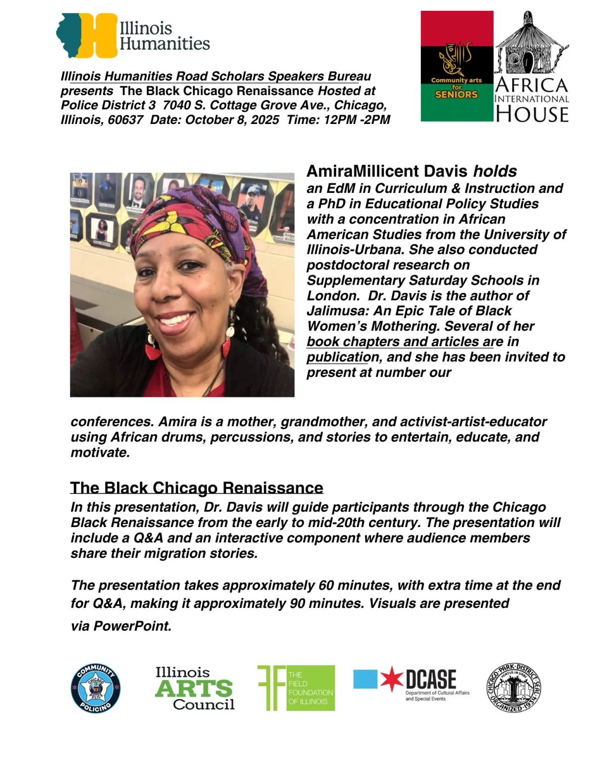 Join us for an inspiring afternoon as Illinois Humanities Road Scholars Speakers Bureau presents The Black Chicago Renaissance, a special event with Dr. Amira Millicent Davis.