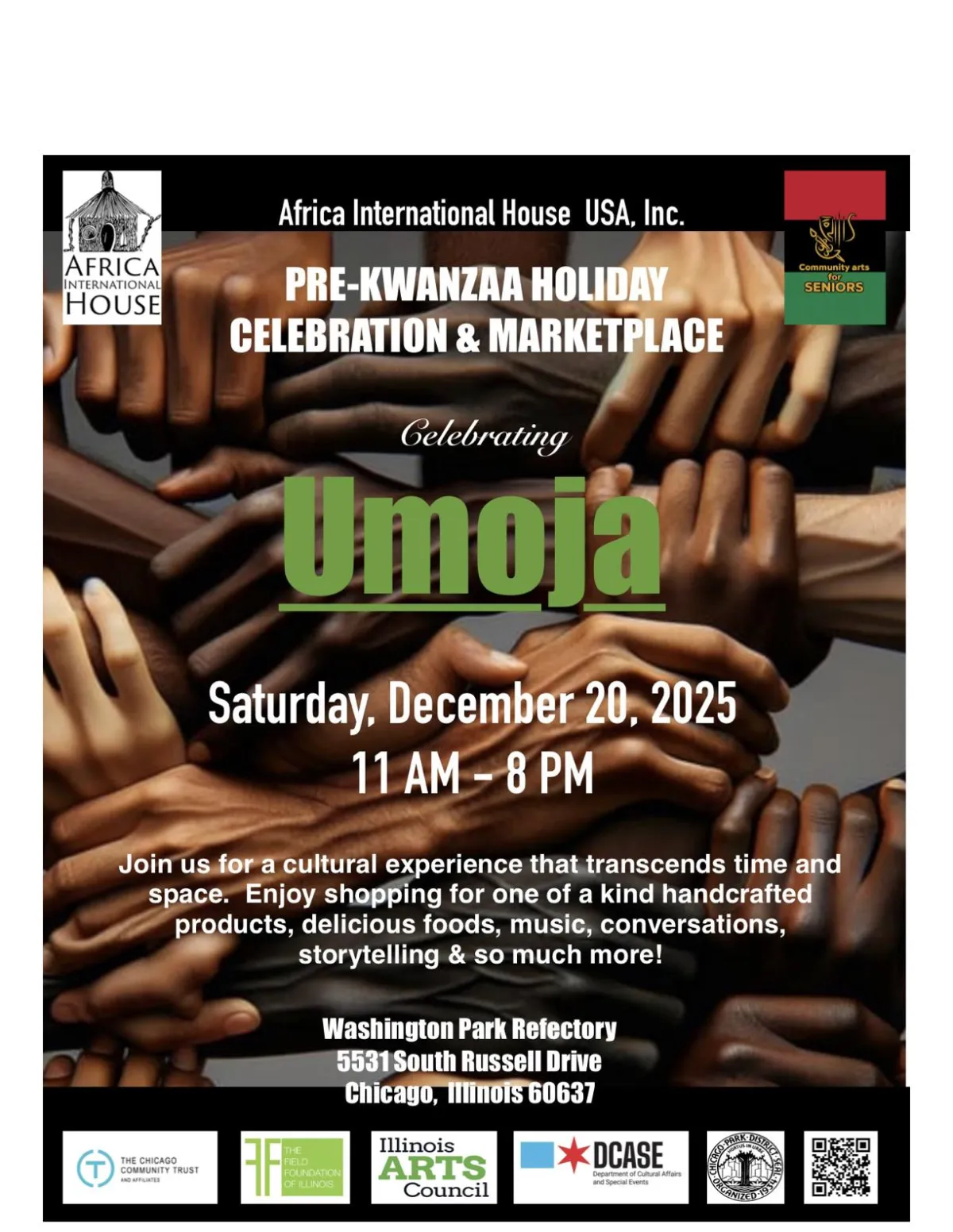 Join Africa International House USA, Inc. for a joyful, day-long celebration — Kwanzaa Our Way! This special event, part of AIH’s Pre-Kwanzaa Celebration & Marketplace, honors our rich heritage, creativity, and community spirit through art, fashion, dance, and fellowship.